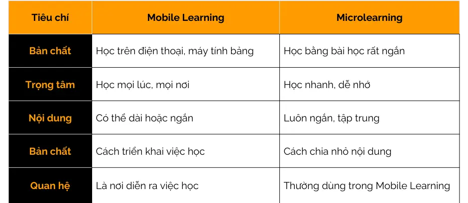 Bảng phân biệt Mobile Learning và Microlearning