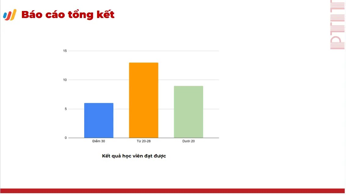 - Nhóm đạt từ 20–28 điểm: là nhóm đông nhất, cho thấy phần lớn sinh viên nắm vững nội dung khóa học và hoàn thành tốt các yêu cầu đánh giá.